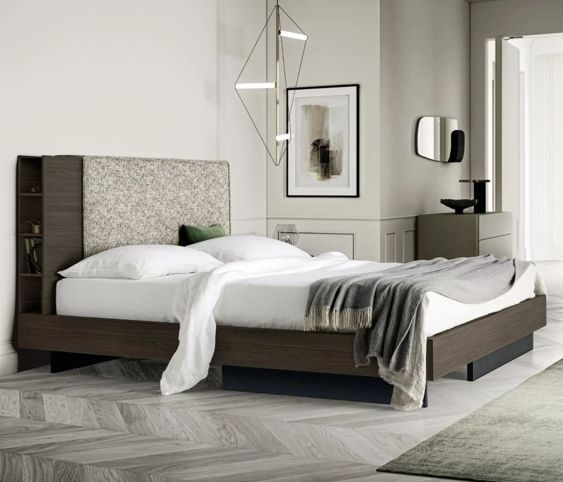 Se desideri ricreare un'atmosfera intima e rasserenante, il modello mostrato in foto fa per te: nella stanza del riposo dovrai ricreare un'atmosfera rasserenante, per farti rigenerare le energie tutte le notti. Se desideri ammobiliare spazi moderni, ti aspettiamo per farti vedere la nostra linea di Arredamento Casa per realizzare il tuo progetto su misura. Sicurezza dei materiali e grande comfort sono gli ingredienti che distinguono tutti i prodotti della marca, tra cui anche il letto in tessuto nell'immagine. Con il Letto in melaminico e tessuto Plinio di SantaLucia del noto e conosciuto marchio, leader del settore, potrai arricchire la tua zona notte garantendoti comodità, praticità e un design pulito. Scopri in negozio un ricco catalogo di Letti imbottiti, mobili e complementi per la camera da letto dei migliori produttori.